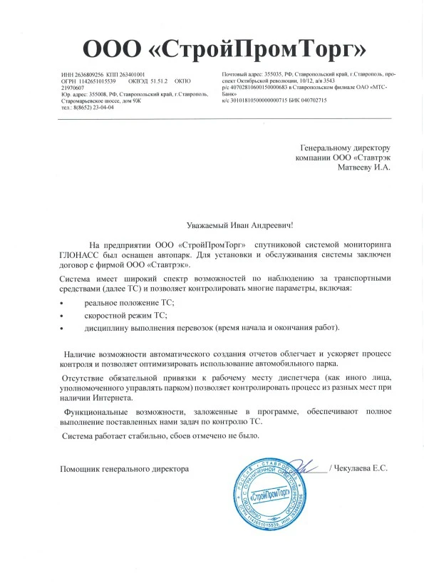 Компания «СтройПромТорг» использует систему спутникового мониторинга ГЛОНАСС, установленную и поддерживаемую организацией «Ставтрэк». Эта система предоставляет богатые возможности контроля автотранспорта, включая отслеживание реального расположения автомобилей, контроль скорости и соблюдения графика работы. Отдельно отмечено удобство автоматических отчетов и отсутствие необходимости жестко привязывать транспорт к конкретным лицам. Система значительно облегчила управление автопарком, работает стабильно и без нареканий.