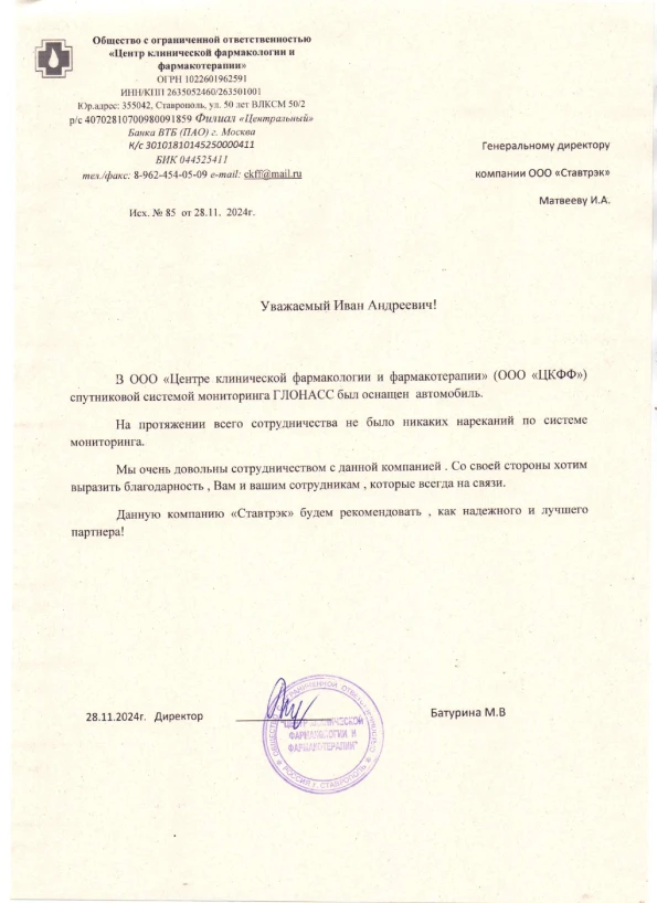 Наша компания постоянно сотрудничает с командой Ставтрэка и успела оценить высокий уровень их сервисов. Особенно понравилась система ГЛОНАСС мониторинга – благодаря ей работа автопарка стала проще и качественнее. Рекомендуем компанию Ставтрэк за внимательное отношение к клиентам и надежную поддержку!