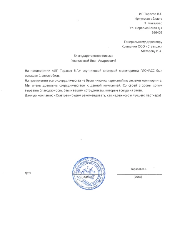 Установили систему спутникового мониторинга ГЛОНАСС на наш автомобиль от компаний «Ставтрэк». За всё время сотрудничества не было никаких проблем, работает великолепно! Особое спасибо менеджерам за оперативность и качественную поддержку в любое время. С уверенностью можем рекомендовать компанию «Ставтрэк» как надёжного и проверенного партнёра!
