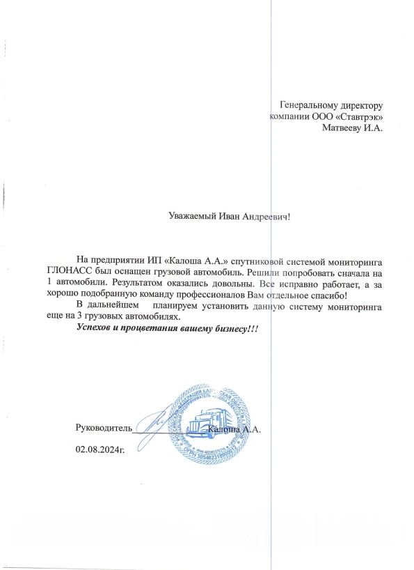 Благодарны компании «Ставтрэк» за надежные решения по ГЛОНАСС/GPS мониторингу транспорта. Благодаря установленному оборудованию мы эффективно контролируем расход топлива и работу тахографов, что значительно оптимизировало наш бизнес. Очень довольны дружелюбным подходом, быстрой установкой и качественной технической поддержкой. Смело рекомендуем!