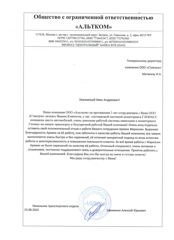 Компания «АЛЬТКОМ» уже несколько лет успешно сотрудничает с ООО «Ставтрэк», используя навигацию и мониторинг ГЛОНАСС на своем транспорте. Особенно признательны за работу сотруднику компании Аревик Маркосян, которая оперативно и профессионально решает любые задачи. Компания «АЛЬТКОМ» довольна обслуживанием и качество сервиса от «Ставтрэк» и рекомендует ее как надежного и открытого к диалогу партнёра.