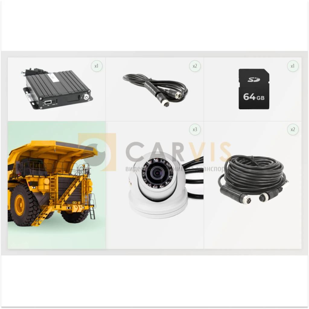 Предлагаемый комплект является стандартным решением для установки видеонаблюдения на карьерной технике. В зависимости от специфических потребностей вашей организации и особенностей транспортных средств, можно разработать индивидуальный комплект видеонаблюдения.