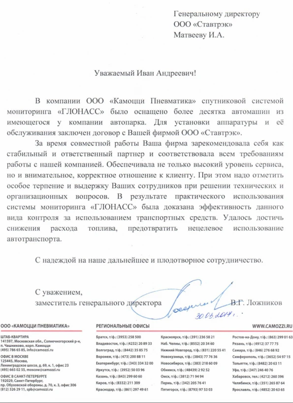 Благодаря компании «Ставтрэк» у нас улучшился контроль за транспортом, существенно снизились пробеги и повысилась дисциплина среди водителей. Особенно понравилась профессиональная и оперативная помощь сотрудников технической поддержки. Искренне рекомендуем!