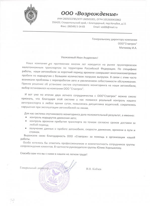 Руководство по эксплуатации ВЕГА М-300 396.32 кб СКАЧАТЬ Уже два года сотрудничаем с ООО «Ставтрэк» и очень довольны системой спутникового мониторинга. Благодаря ей улучшили контроль транспорта, дисциплину водителей и сократили число нарушений. Благодарим за профессионализм, оперативную помощь и поддержку.