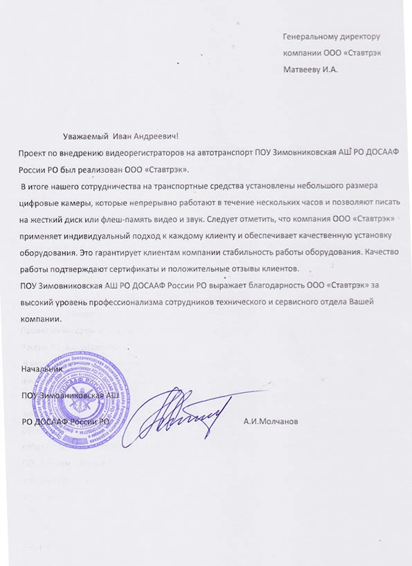 Компания «Ставтрэк» успешно реализовала проект установки компактных видеорегистраторов на наш автотранспорт. Установленные камеры работают без перебоев длительное время, обеспечивая качественное сохранение записей. Особенно порадовал профессиональный подход сотрудников к индивидуальным пожеланиям. Благодарим за высокое качество, стабильность и отличное отношение к клиентам!