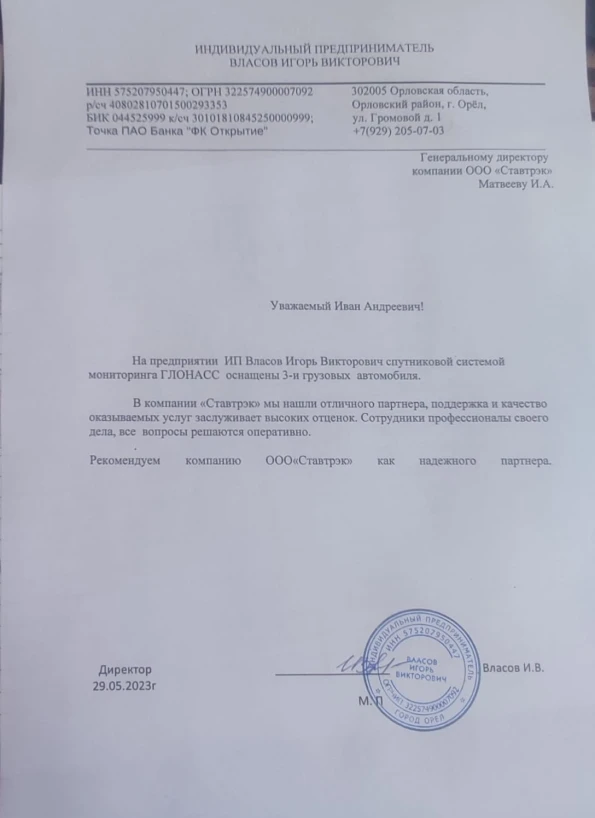 Выражаем искреннюю благодарность команде компании «Ставтрэк» за высокое качество и оперативность обслуживания систем мониторинга транспорта ГЛОНАСС/GPS. Очень ценим ваш профессионализм и внимательное отношение, рассчитываем продолжать взаимовыгодное сотрудничество!
