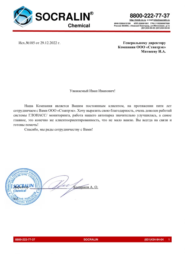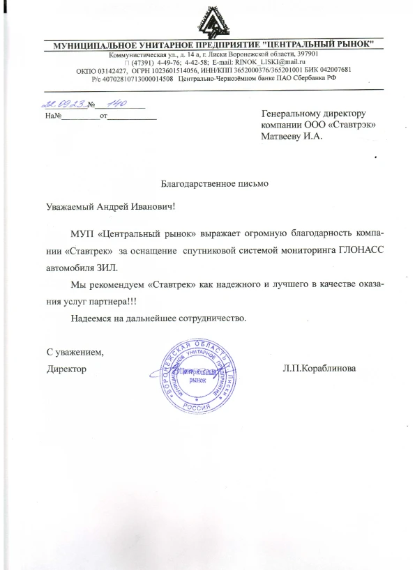 Пользуемся услугами компании «Ставтрэк» уже около пяти лет и очень довольны нашим выбором. Благодарны за отличный сервис и качественную работу системы ГЛОНАСС мониторинга. Благодаря вам, работа нашего автопарка стала заметно эффективнее. Особенно ценим клиентоориентированный подход, внимательность и постоянную готовность оказать помощь. Очень рады длительному и плодотворному сотрудничеству!