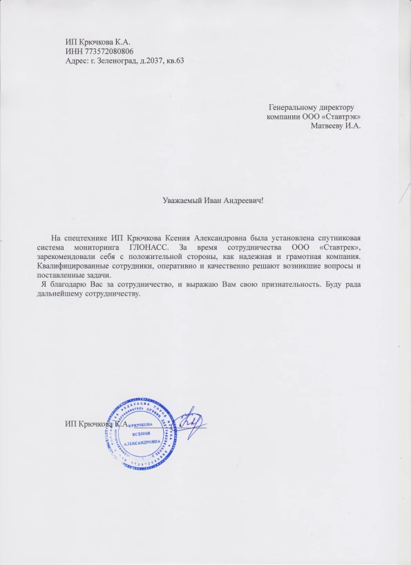 Искренне благодарим команду компании «Ставтрэк» за продуктивную совместную работу и открытый подход к взаимному взаимодействию. Особенно хотим отметить прекрасный уровень коммуникации и надежность в партнерстве. Желаем компании дальнейших профессиональных успехов, финансового роста и укрепления отношений с партнерами. Будем рады продолжению такого приятного и эффективного сотрудничества!