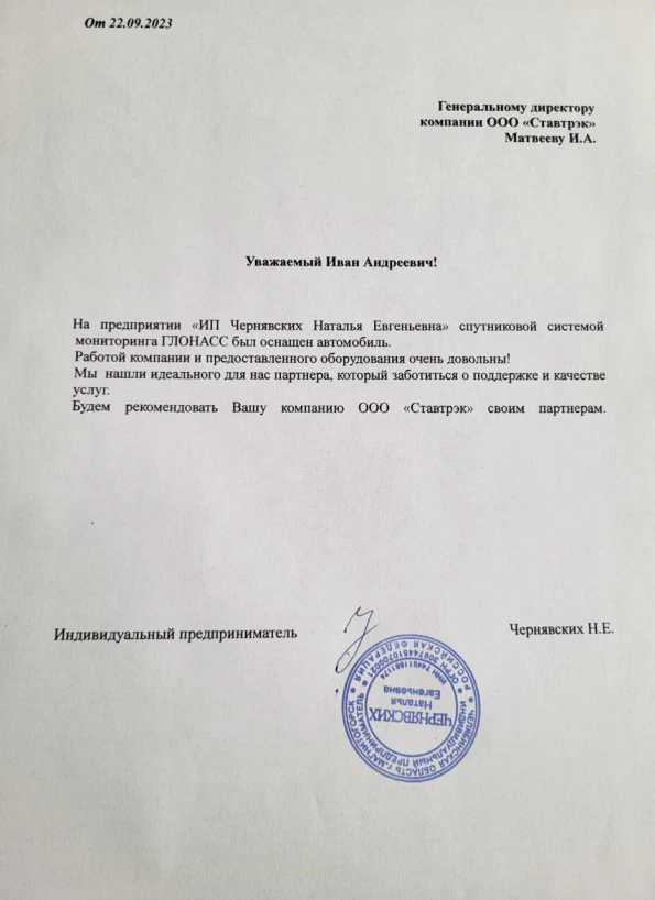 Хотим искренне поблагодарить компанию Ставтрэк за качественную работу и оперативную помощь. У нас на предприятии используется система спутникового мониторинга ГЛОНАСС на 20 технических единицах, и специалисты компании всегда готовы быстро и компетентно проконсультировать по любым техническим вопросам. Благодарны за профессионализм, надежность и высококлассный сервис. Желаем дальнейших успехов и процветания вашему бизнесу!