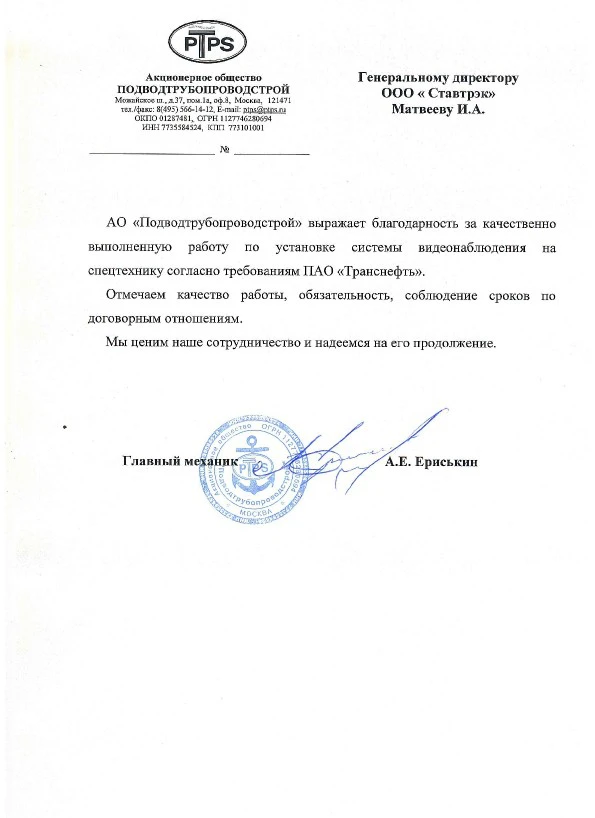 Выражаем благодарность компании «Ставтрэк» за профессиональный монтаж системы видеонаблюдения. Все работы были выполнены качественно и точно в срок, с полным соблюдением наших требований. Надеемся на дальнейшее успешное сотрудничество!