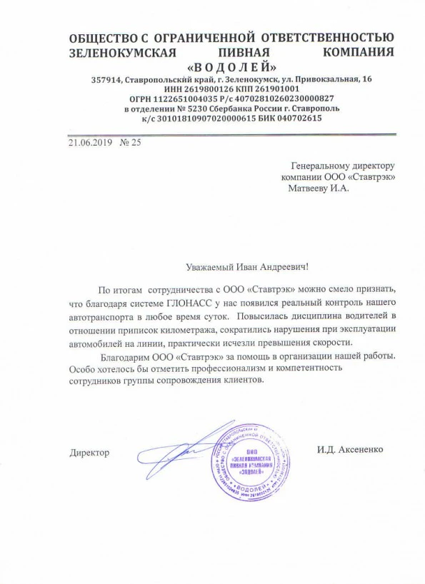 На нашем предприятии внедрили спутниковую систему ГЛОНАСС от компании «Ставтрэк», и результат нас очень порадовал! Транспорт стал функционировать значительно эффективнее, за что хотим поблагодарить вашего производителя. Надеемся на дальнейшее такое же отличное сотрудничество!