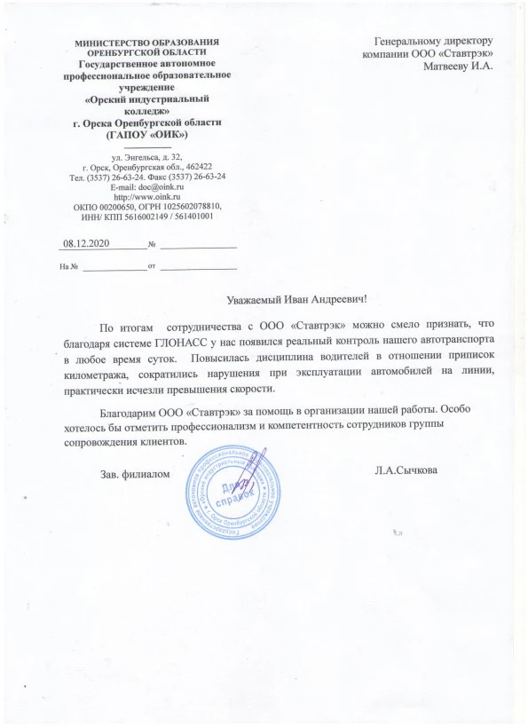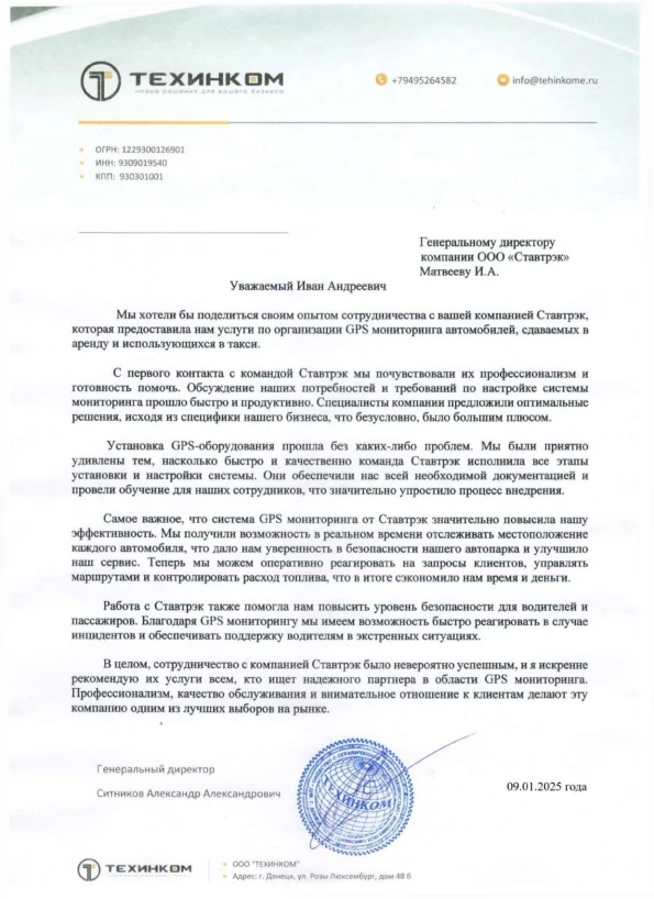 Декларация о соответствии (камеры) 756.22 кб СКАЧАТЬ Декларация о соответствии (регистраторы) 780.93 кб СКАЧАТЬ Инструкция к регистратору 4.81 мб СКАЧАТЬ Сотрудничество с компанией Ставтрэк оставило самые положительные впечатления. Профессиональная команда оперативно и качественно установила GPS-систему мониторинга, адаптировала её под наши запросы и провела обучение сотрудников. В результате удалось существенно повысить эффективность автопарка, уменьшить расходы на сервис и поднять безопасность перевозок. Рекомендуем решение от Ставтрэк всем, кто заинтересован в надежном спутниковом мониторинге транспорта.