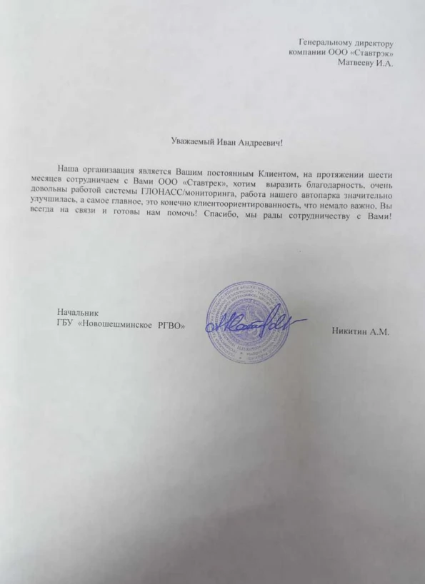 Хочется выразить благодарность компании ООО «Ставтрэк» за отличную работу и качественное обслуживание системы ГЛОНАСС/мониторинга. За полгода нашего сотрудничества мы заметили улучшение работы автопарка и высокую клиентоориентированность сотрудников компании. Очень ценим, что вы всегда оперативно отвечаете на наши вопросы и помогаете решать любые задачи. Рекомендуем вас другим клиентам!