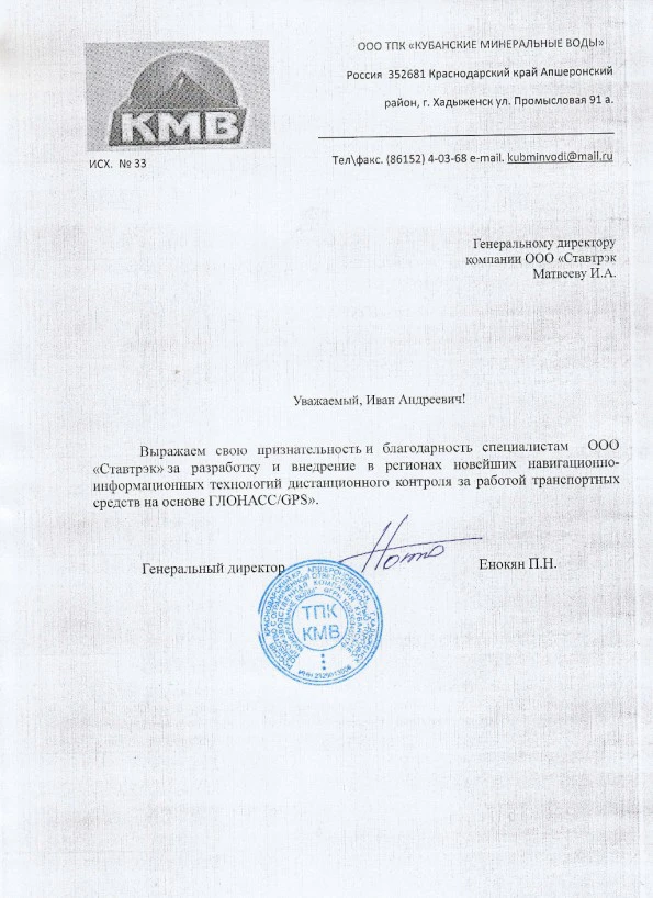 Выражаем искреннюю благодарность компании «Ставтрэк» за отличную реализацию современных решений на основе системы ГЛОНАСС/GPS. Благодаря специалистам «Ставтрэк» теперь оперативный дистанционный контроль транспорта в нашем регионе стал более удобным и эффективным.