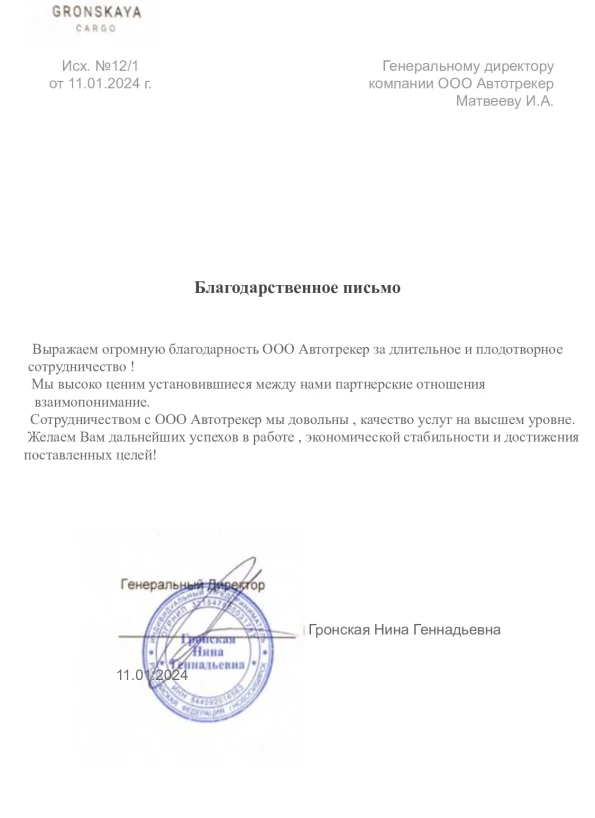 Хотим искренне поблагодарить команду ООО Автотрекер за стабильно высокое качество услуг и успешное, продуктивное сотрудничество на протяжении долгого времени! Радует прекрасно налаженное партнёрство и взаимопонимание. Будем рады дальнейшей совместной работе и желаем вам процветания и новых успехов!
