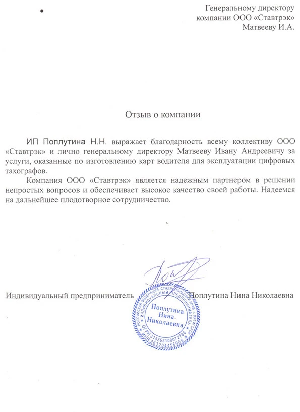 Выражаю огромную благодарность компании «Ставтрэк» за оперативную помощь и качественную работу по изготовлению карт водителя для цифровых тахографов. Специалисты отлично справились с задачей и успешно решили все возникшие вопросы. Рассчитываю на долгое и продуктивное сотрудничество в будущем!