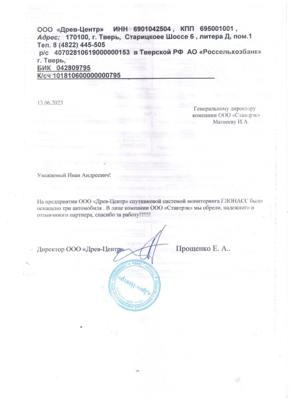 Благодарим компанию «Ставтрэк» за отличную совместную работу! Особенно хотим подчеркнуть высокий профессионализм, оперативность сотрудников и внимание к деталям в реализации проекта по системе мониторинга ГЛОНАСС/GPS. Надеемся продолжать такое же успешное сотрудничество и в будущем!