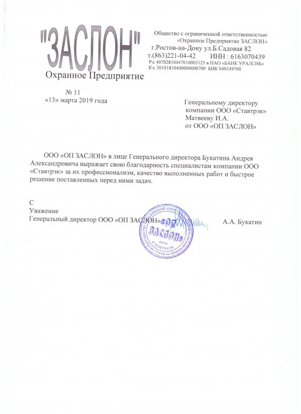 От всей компании хотим выразить искреннюю благодарность сотрудникам ООО «Ставтрэк» за ответственный подход и высокий профессионализм. Вся работа была выполнена качественно и оперативно, точно соответствуя нашим пожеланиям. Рекомендуем эту компанию как надежного и знающего свое дело партнёра!