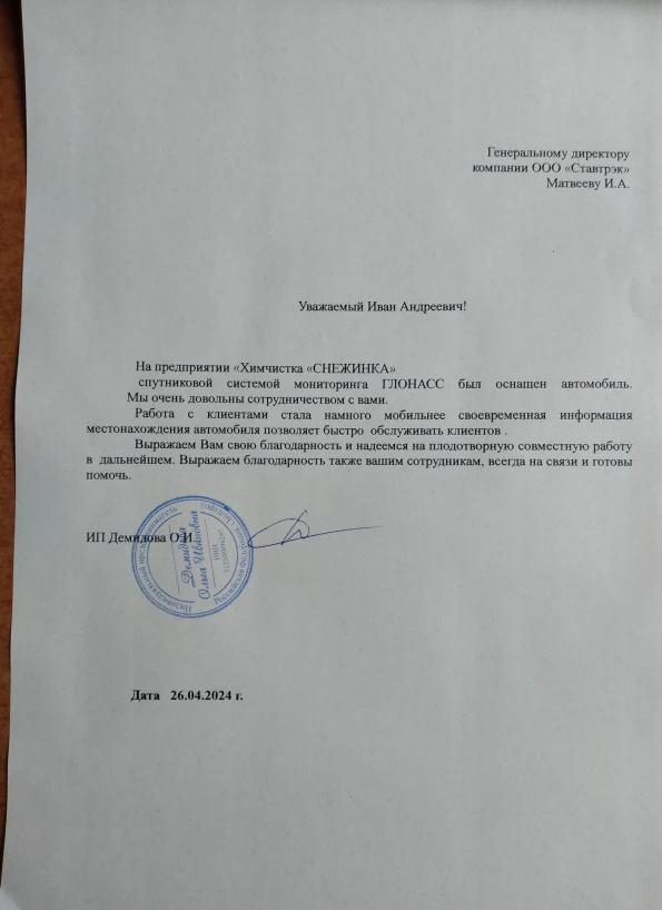 Мы установили систему мониторинга ГЛОНАСС от компании «Ставтрэк» на наш автомобиль и остались очень довольны результатами. Теперь работать с клиентами стало удобнее и быстрее благодаря оперативной информации о местонахождении машины. Благодарим команду «Ставтрэк» за качественную работу и будем рады дальнейшему сотрудничеству!