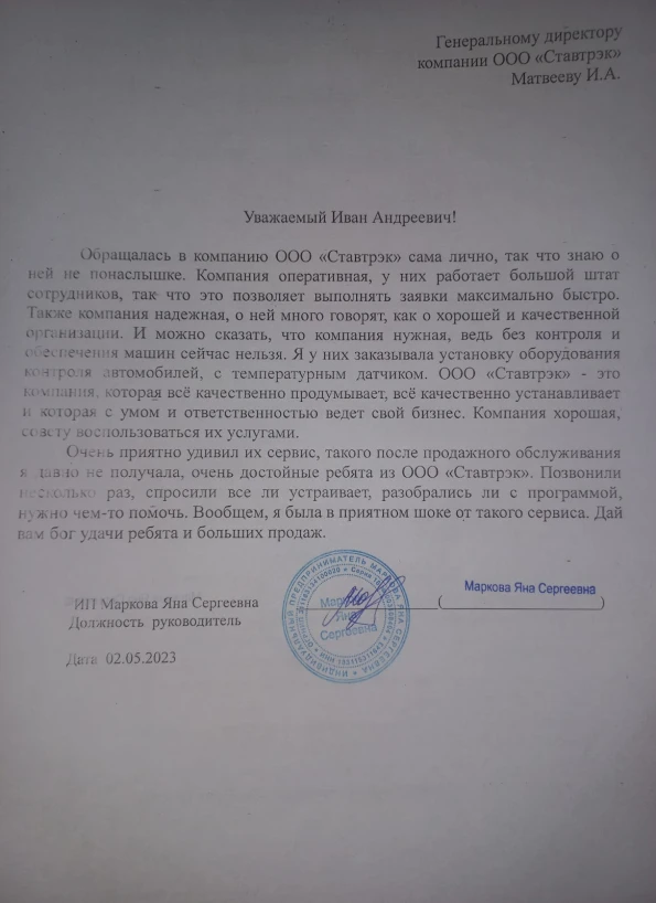 Уже несколько раз сотрудничала с компанией «Ставтрэк» и осталась очень довольна их работой. У ребят прекрасная организация работы, заявки выполняются максимально оперативно и качественно. Особенно отмечаю высокий уровень сервиса и заботу сотрудников о клиенте после продажи оборудования — звонят, интересуются, все ли в порядке, нужна ли помощь. Такой подход действительно радует и удивляет! Смело рекомендую компанию и желаю успехов!