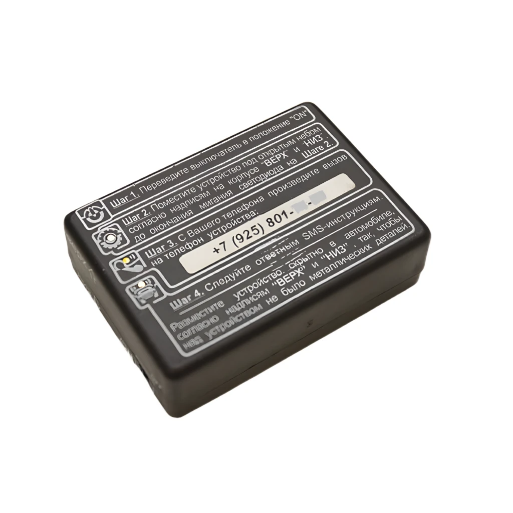 Устройство скрытно размещается в автомобиле, не подключаясь к его бортовой цепи. Размеры устройства позволяют спрятать его в самых непредсказуемых и труднодоступных для злоумышленника местах. В автомобиле таких мест много.