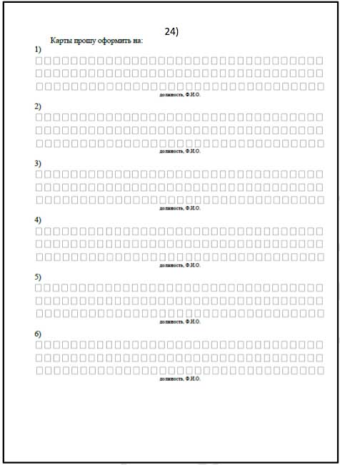 В позиции 24) указывается должность, фамилия, имя, отчество лица, на которое оформляется(ются) карта(ы) (см. позицию 14).