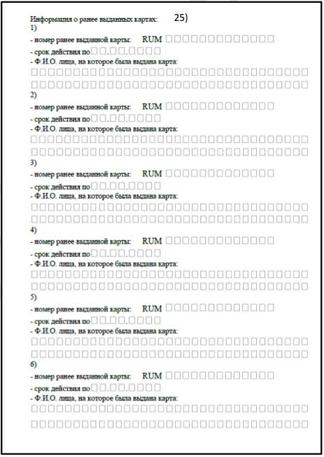 В позиции 25) указывается номер, срок действия, ранее выданных карт, ф.и.о. лица, на которое были оформлены ранее выданные карты. Данная позиция заполняется в случае обновления карт (выдачи карт на новый срок).