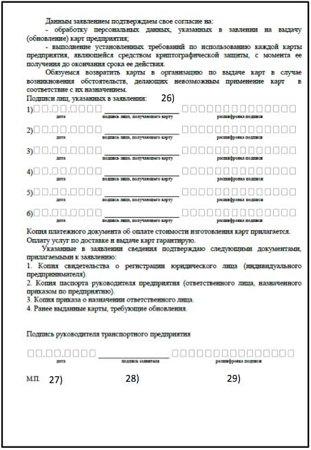 В позиции 26) указывается дата подписи, подпись, расшифровка Ф.И.О. лица, на которое оформляется(ются) карта(ы).